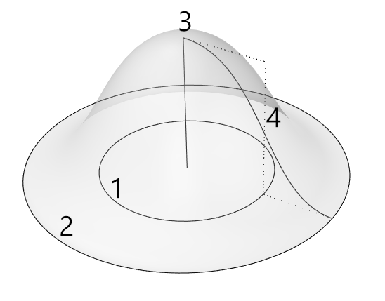 از هر کدوم از سه گزینه این دستور که استفاده کنید، اول از شما خواسته میشه یه دایره ترسیم کنید که شعاع تاثیر جابجایی رو مشخص میکنه و بعد بهش ارتفاع بدید. تا قبل از تایید نهایی، همچنان میتونید شعاع تاثیر، ارتفاع و نحوه کاهش تدریجی تاثیر (Falloff) رو تغییر بدید. تو این شکل با کشیدن دایره درونی (۱) نحوه کاهش تدریجی تاثیر رو میتونید کنترل کنید. با کشیدن دایره بیرونی (۲) شعاع تاثیر رو میتونید تغییر بدید و با کشیدن نقطه (۳) به سمت بالا و پایین بیشترین میزان تاثیر رو میتونید تعیین کنید. در واقع با تنظیم این سه گزینه شما دارید شکل کرو (۴) رو تغییر میدید.