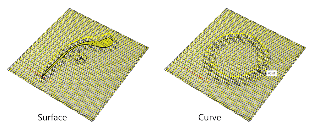 حالا بسته به این که گزینه Curve یا Surface رو انتخاب کرده باشید تمام نقاطی که به منحنی یا سطح انتخاب شده نزدیک باشن به اندازه بیشترین ارتفاع تعیین شده جابجا میشن و نقاطی که از منحنی یا از لبههای سطح انتخاب شده دورتر باشن، بسته به فاصلهشون با توجه به تنظیمات کاهش تدریجی تاثیر (تصویر بالا) رفته رفته کمتر ارتفاع میگیرن. نقاطی هم که فاصلهشون با منحنی یا لبههای سطح بیشتر از شعاع تاثیر باشه هیچ تغییری نمیکنن.