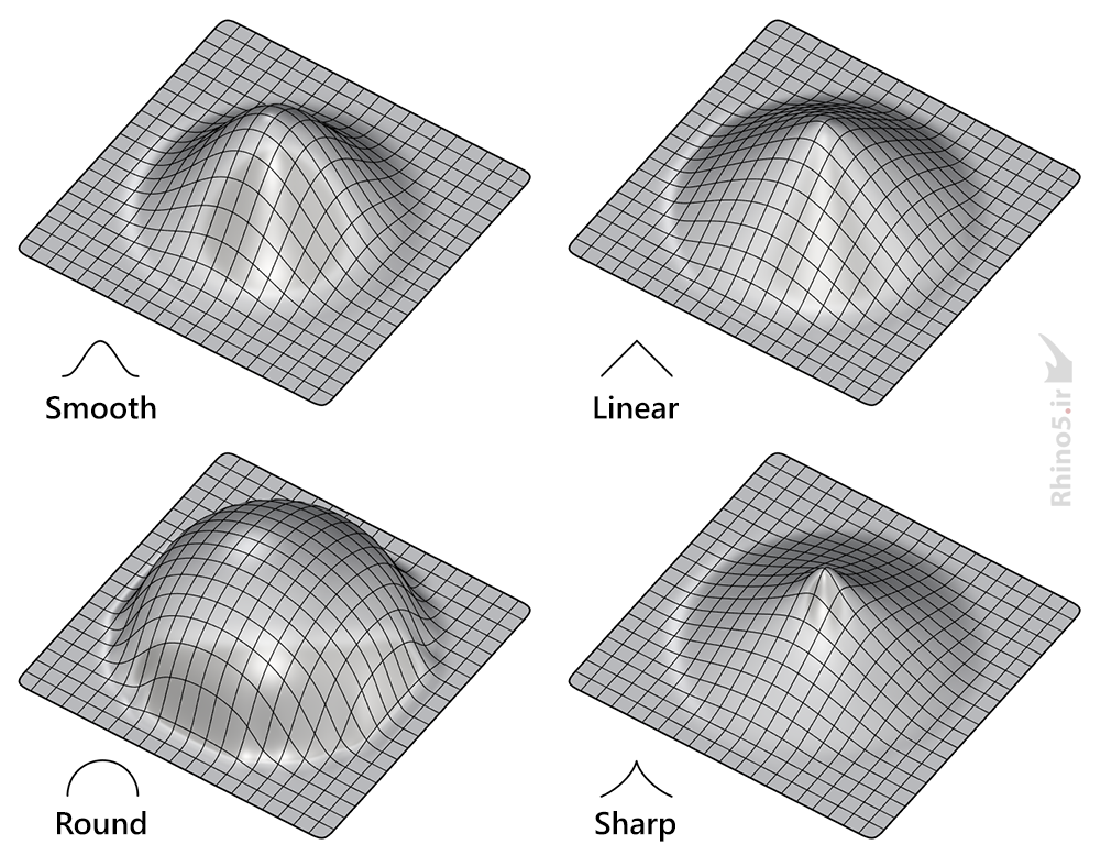 در توضیحات دستور SoftMove اشاره شد که شکل کاهش تدریجی تاثیر، با جابجا کردن دوتا دایره مشخص میشه. در مورد دستور SoftTransform اما چهار تا شکل از پیش آماده داریم. که از قسمت Shape با کلیک روی آیکن مربوط به هر کدومش میتونید شکل مورد نظرتون رو انتخاب کنید. نحوه کاهش تدریجی تاثیر برای هر کدوم از این چهارتا شکل تو تصویر زیر نشون داده شده.