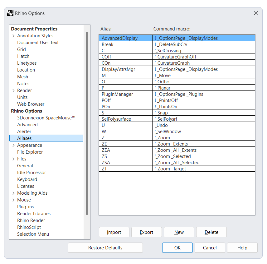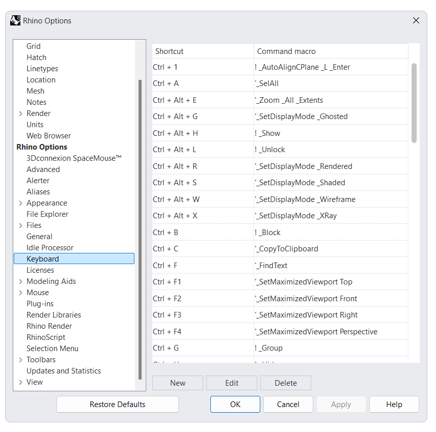 - با کلیک روی دکمه Restore Defaults میتونید تمام کلیدهای میانبر و اسم مستعارهای تعریف شده رو به حالت پیشفرض راینو برگردونید.